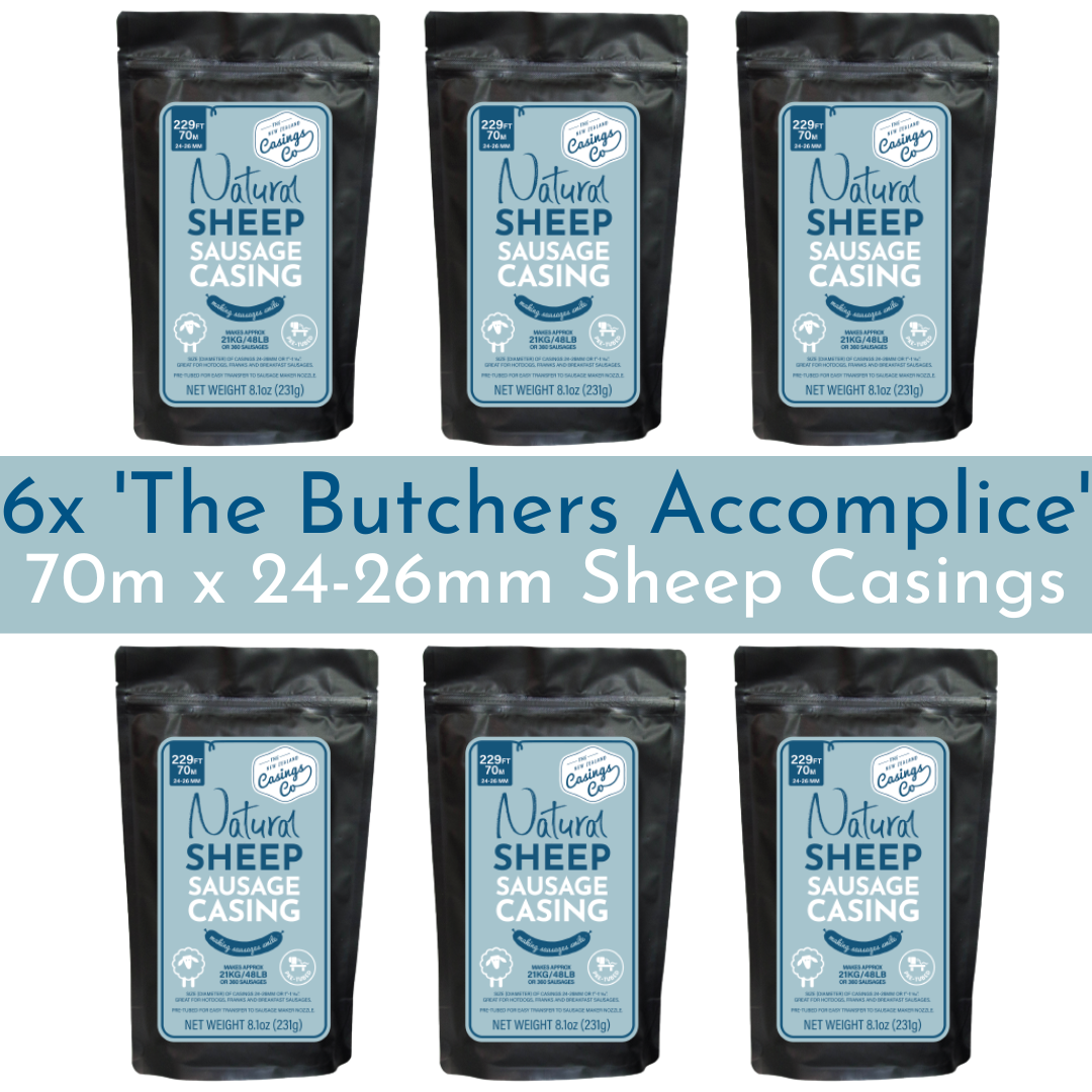 $92.94 NZD6 Pack - 'The Butchers Accomplice' Natural Sheep Casings 24-26mm, 70m.