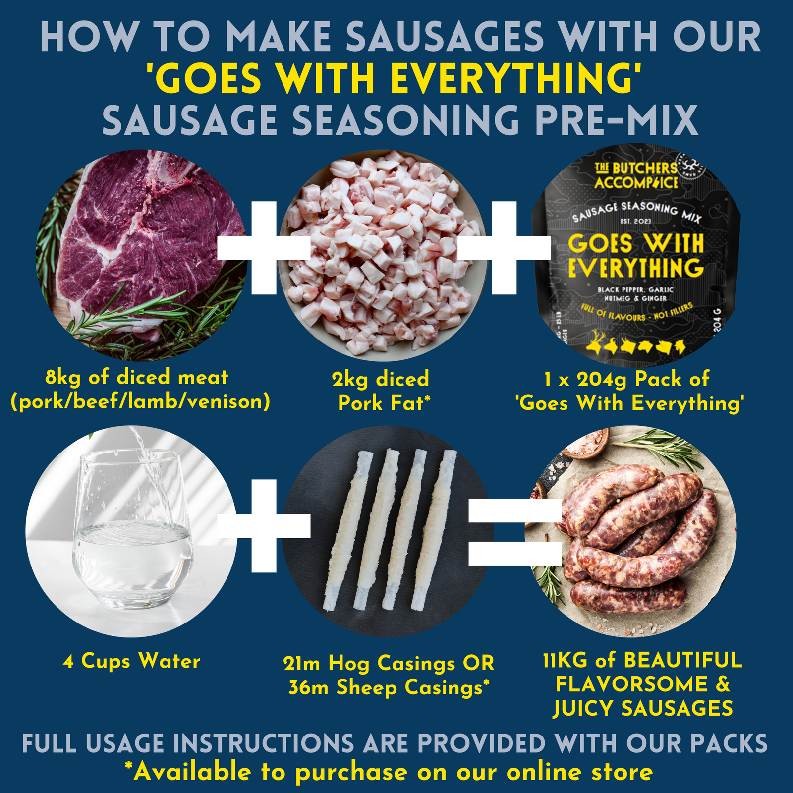 Our sausage seasoning packs include all of the herbs, spices, ingredients and full usage instructions you need to make lip smackingly good sangers. All you need to add is the meat, fat, casings and water (although a cold brew, sizzling BBQ and some mates is also recommended).